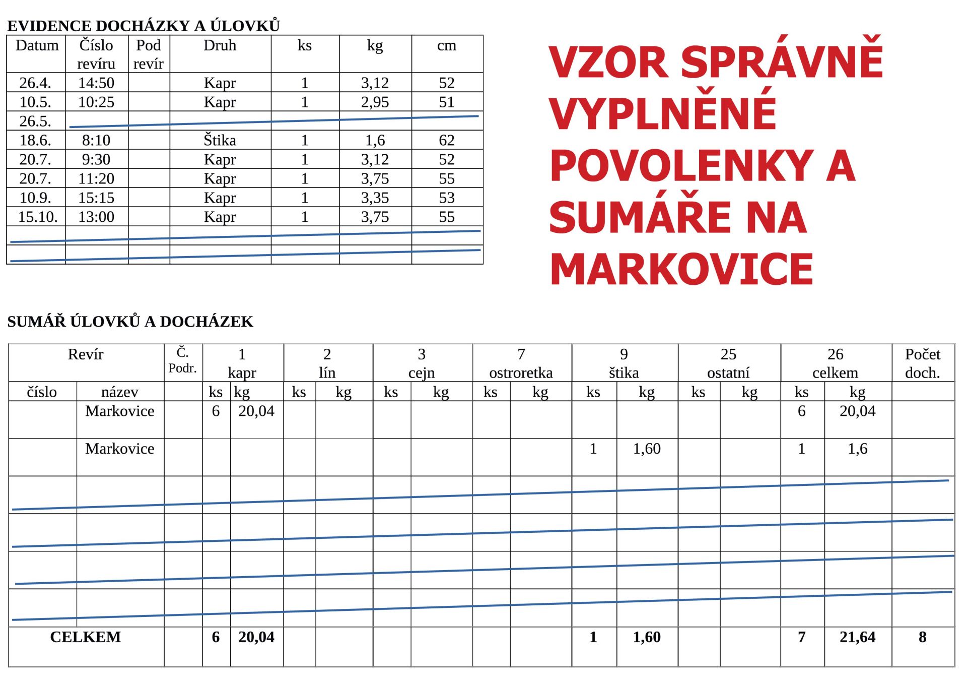 Upozorňujeme na povinnost vrátit povolenku na Markovický rybník do 15 dnů po skončení její platnosti. Platnost povolenky končí buď posledním dnem období, na které byla vydána, nebo dosažením maximálního povoleného počtu ponechaných ryb. Jinými slovy: po ponechání si 20. kusu ušlechtilé ryby v tomto roce, má držitel povolenky 15 dnů na její vrácení.