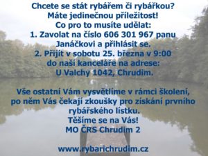 Termín letos posledního školení a rybářských zkoušek se blíží – konají se již v sobotu 25. března!